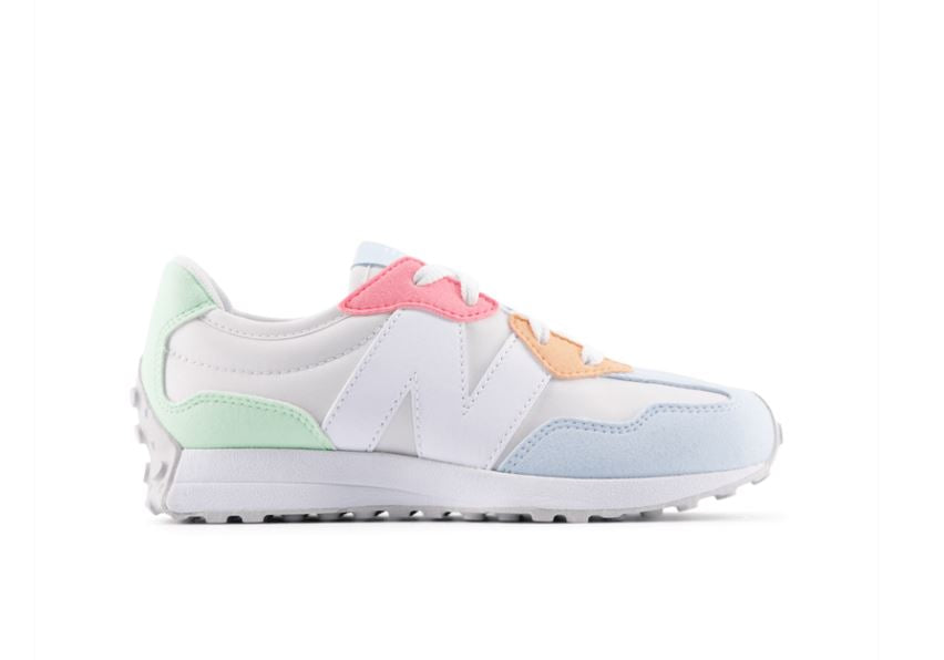 From the rollout of technological advancements like improved cushioning and specialized outsole construction to the introduction of the iconic ‘N’ logo, the 1970s were a pivotal time in New Balance’s history. The 327 boldly reimagines the brand’s running heritage, with a contemporary-minded reworking of classic design elements that, individually, would be considered hallmarks of ‘70s simplicity. With an angular reworking of the aerodynamically minimalist wedge silhouette, asymmetrically applied, oversized ‘N’ branding, and a wraparound, trail-inspired lug outsole, the 327 sheds new light on the ‘70s as an era of innovation. This 327 for kids pares down the classic model for growing feet.